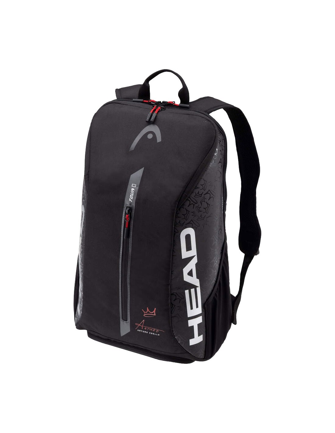 De COELLO TOUR PADEL BACKPACK 25L biedt exclusieve, elegante stijl, van de tennisbaan tot de stad en waar je dag je ook brengt. Deze rugzak, onderdeel van de collectie van Arturo Coello, is ontworpen en ontwikkeld in samenwerking met ‘King Coello’; zijn kroonlogo aan de zijkant heeft een glossy afwerking en verbetert de look. Het zilveren HEAD-logo zorgt voor contrast en stijl, opvallend tegen het zwart, en de persoonlijke touch is de keuze van rood - een van de favoriete kleuren van Coello - voor de binnenkant van de tas. Kroonlogo's op de banden dragen bij aan de opvallende, hoogwaardige uitstraling van een rugzak waar de fans van Coello van zullen houden.