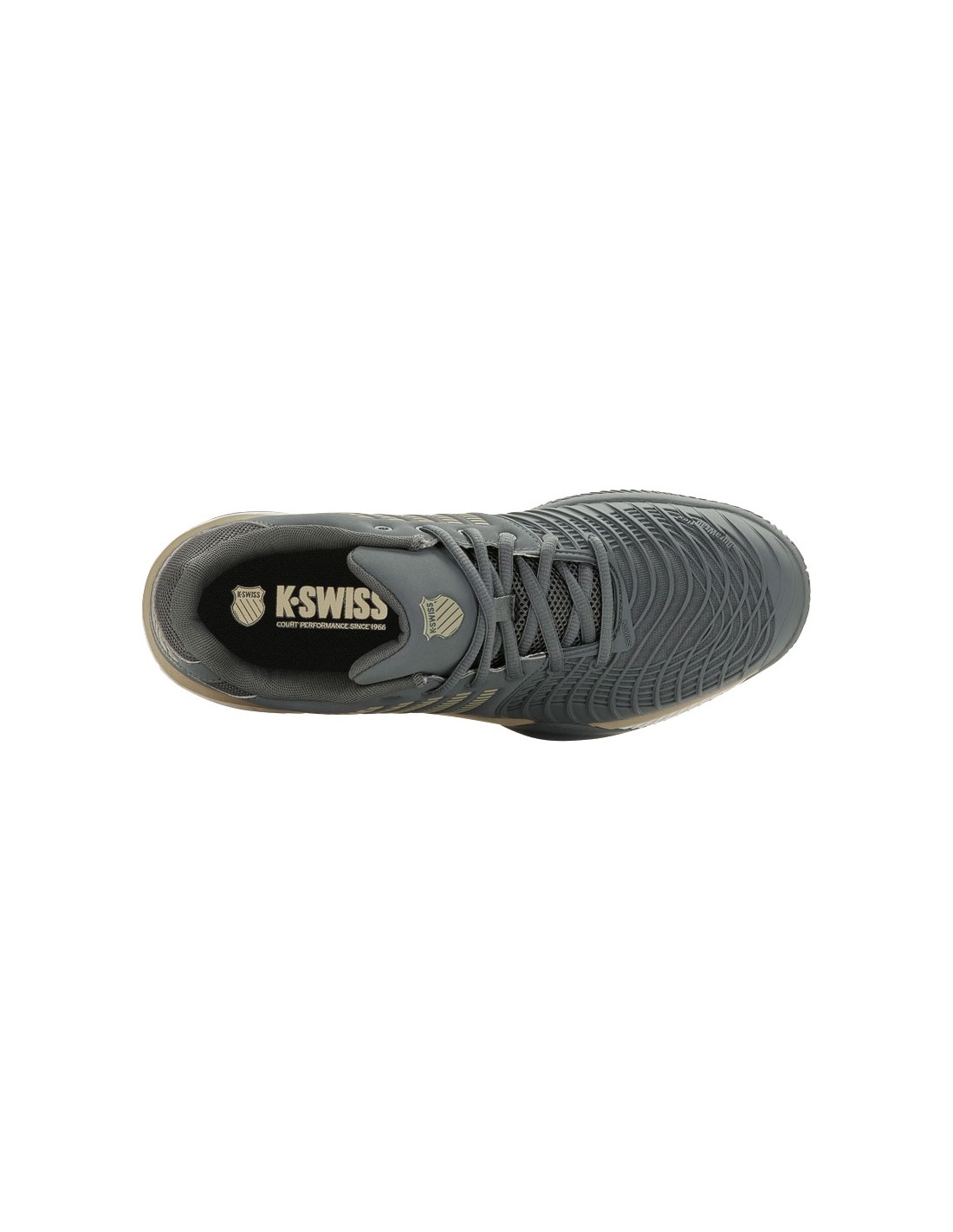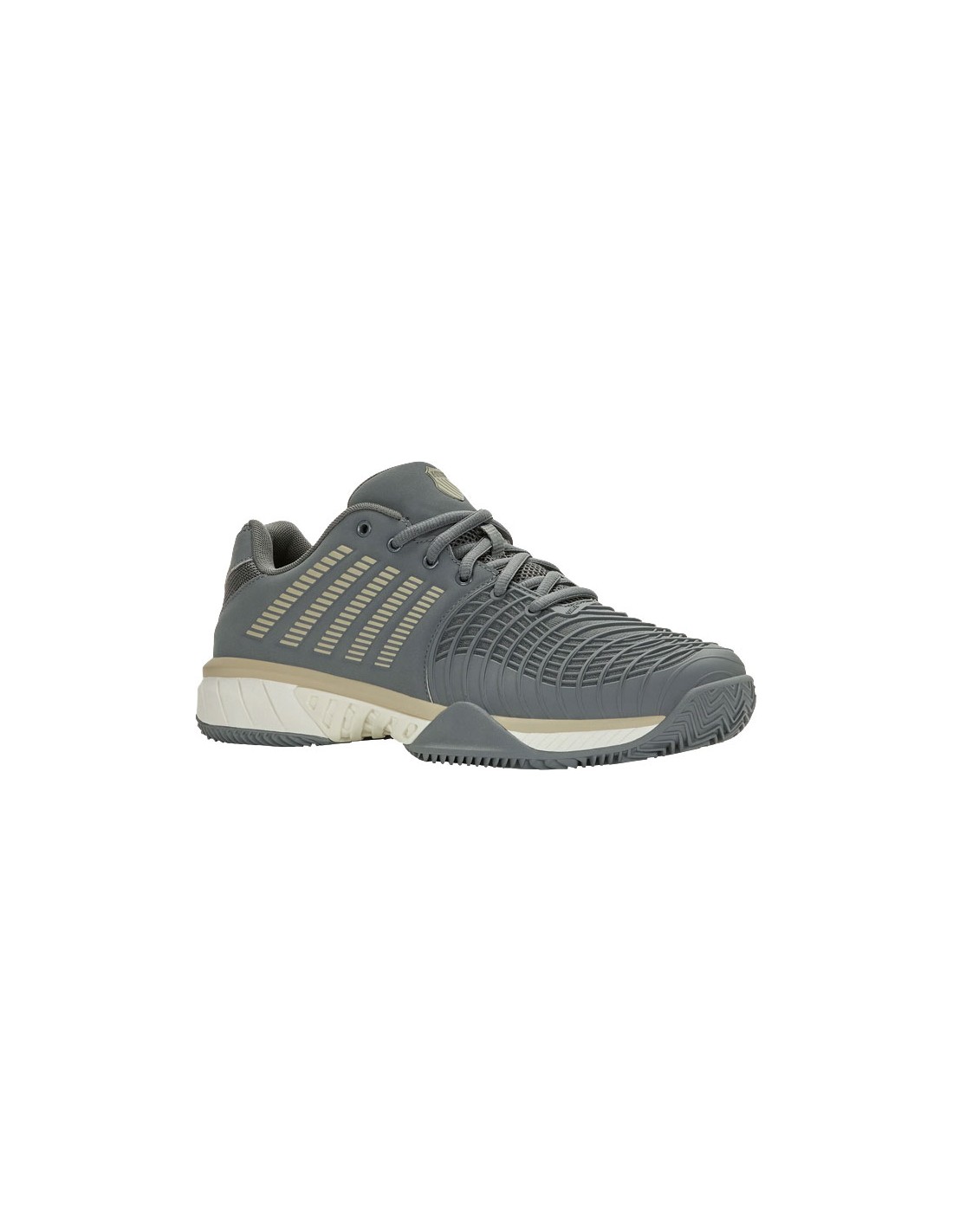 Het visgraatprofiel maakt de Kswiss Express Light 3 Clay (Turbulence/Egret) geschikt voor het spelen op kunstgras-,smashcourt en gravelbanen, maar ook voor padelbanen.